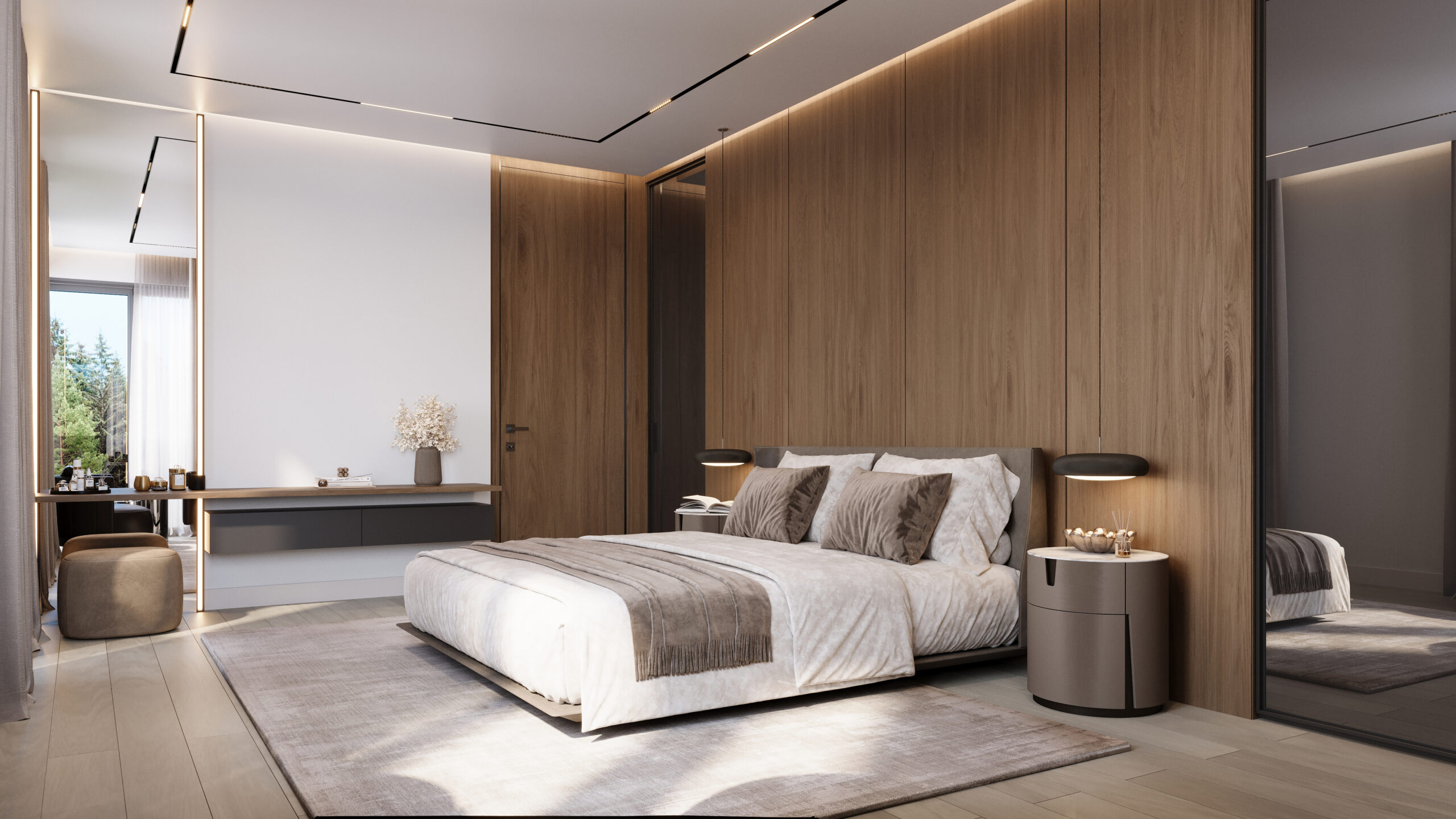 Doğal ışığın dans ettiği mimari, özel giyinme odası ve geniş yatak alanıyla bütünleşiyor. Gündelik telaşın ötesine geçip, sadece senin için ayrılmış bir dinlenme limanı.