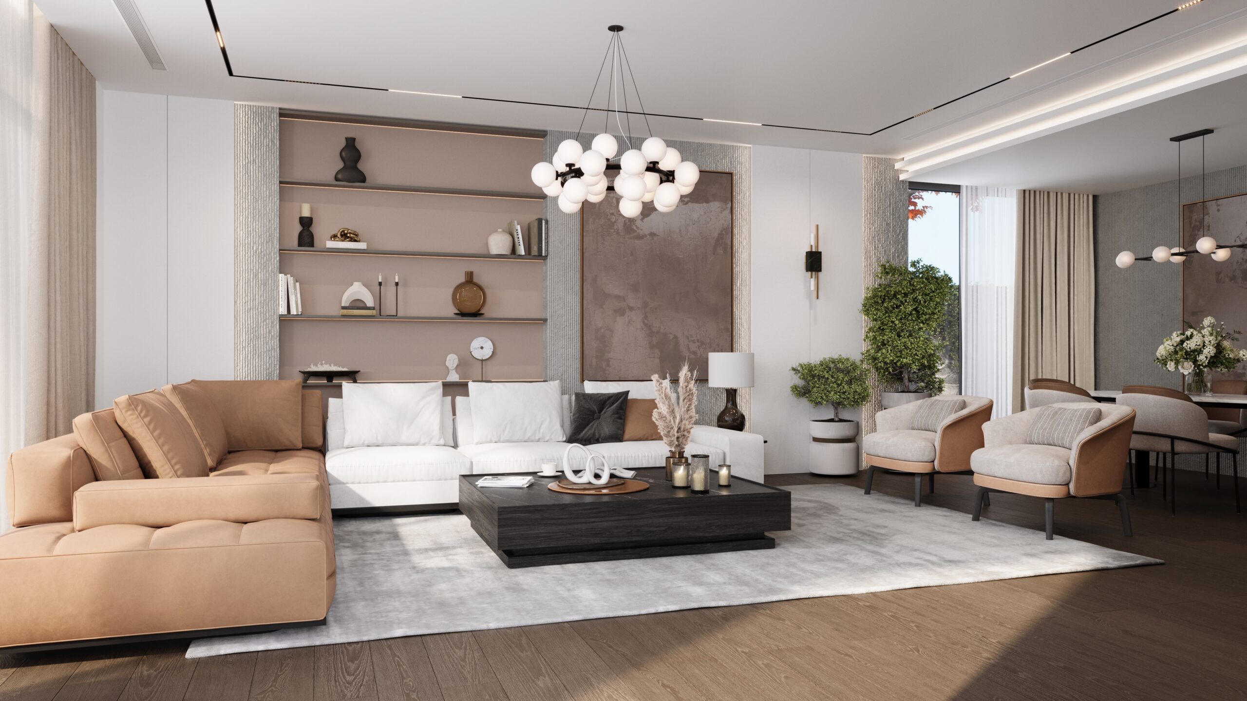 Yumuşak dokular, sıcak tonlar ve zarif dekorasyon detaylarıyla şekilleniyor. Aileyle geçirilen sessiz anlar, film geceleri ya da yalnız başına huzur bulmak için zamanın durduğu nokta.
